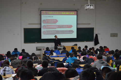 李刚教授以《中国特色社会主义道路、理论和制度创新与自信》为主题,以党的十八大报告为蓝本,结合个人体会,提取出中国特色社会主义道路的创新、中国特色社会主义理论体系的创新、中国特色社会主义制度创新与改革、理论自觉和实践自信是共产党人的基本品格四个方面。李刚教授在讲授中条分缕析、深度挖掘,着重介绍了道路创新、理论创新、制度创新之“三大创新”和道路自信、理论自信、制度自信之“三个自信”。在三大创新和三个自信之下,他以点带面,融合了关于中国特色社会主义道路的新表述、科学发展观成为行动指南、中国特色社会主义制度创新确立规范等亮点。对于大家关心的经济体制改革五大要求、文化四重作用、“立德育人是教育的根本任务”、“提高教育质量”、“办好人民满意的教育”等话题,李刚教授也以自己独特的视角进行了分析归纳。结合买球官网的学科特点,李刚教授特别提到“生态文明”建设、美丽中国建设中的陕西力量和陕西风采,令在场老师和同学们认识到自己的责无旁待。报告会现场座无虚席,现场不时响起阵阵掌声,传递着大家心中的共鸣。