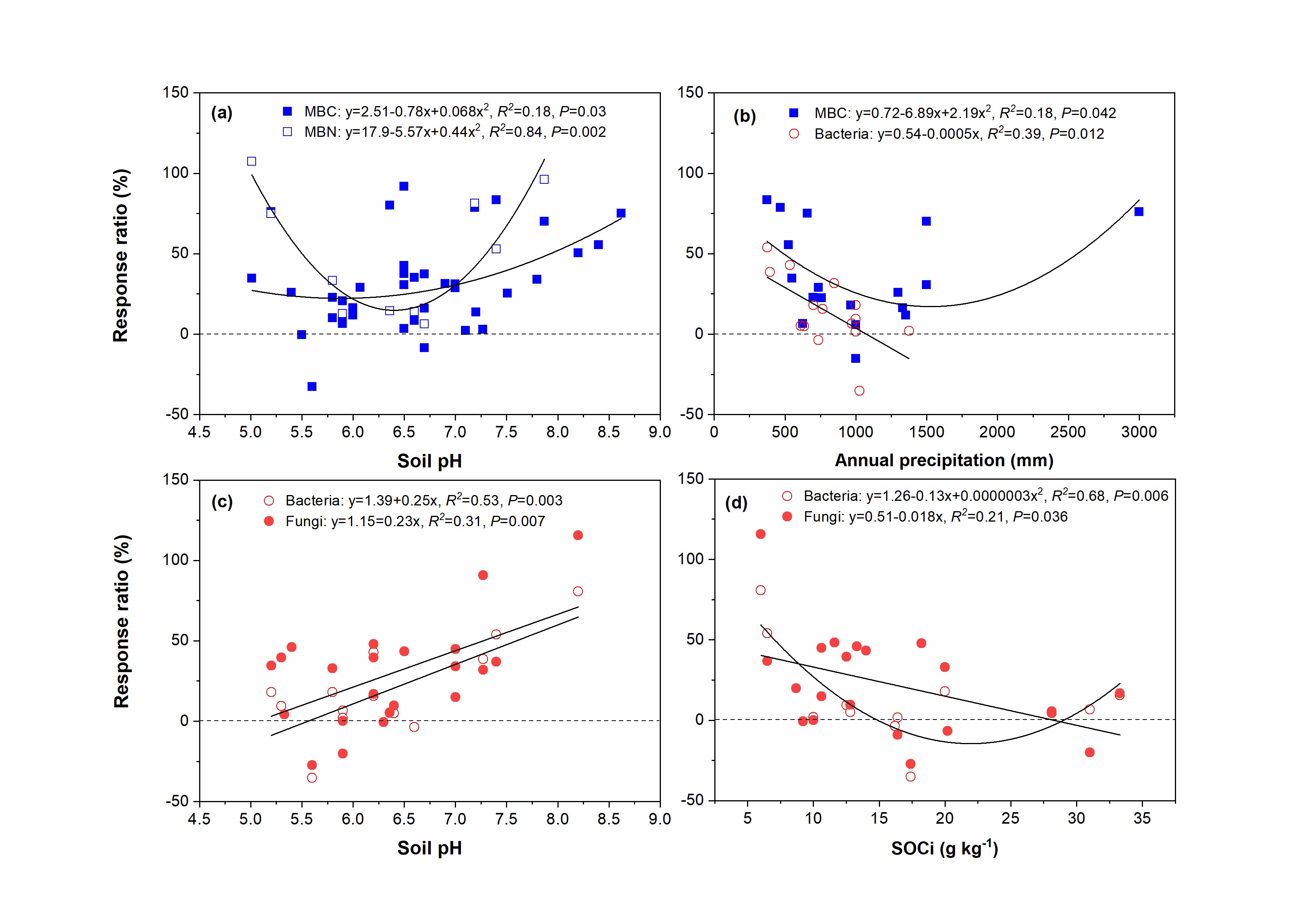 在粮食作物生长休闲期间种植填闲作物可以增加地表覆盖和有机物输入、提高土壤质量及后续粮食作物产量,然而关于填闲种植对土壤微生物丰度和群落结构影响的系统性分析未见报道。王俊教授团队筛选了21个国家81项研究成果的1824对数据,利用整合分析方法系统探讨了填闲种植对农田土壤微生物群落丰度和结构的影响。研究发现,与传统的裸地休闲方式相比,填闲种植导致土壤总磷脂脂肪酸(PLFA)、微生物量碳(MBC)、微生物量氮(MBN)分别提高了24%、40%和51%,土壤细菌总数和真菌总数以及其中的类群增加了7-31%,且填闲种植对真菌的影响大于细菌。与单独种植豆科或非豆科填闲作物相比,二者混播显著降低了土壤MBC、PLFA和放线菌数量。而与将填闲作物残余进行表面覆盖或移除相比,将填闲作物残余翻压入土提高了土壤PLFA、细菌总数、丛植菌根定殖和孢子密度,但降低了革兰氏阳性菌和阴性菌以及丛枝菌根数量。土壤微生物对填闲种植的响应与土壤性质和年降水量有关,中等质地土壤中PLFA、细菌、真菌、放线菌数对填闲种植的响应幅度均大于细质和粗质土壤。总体来看,与裸地休闲相比,填闲种植可以通过提高土壤微生物群落丰度、改变群落结构来提高土壤质量。该研究成果受中科院“西部引进人才”项目和国家自然科学基金支持,已在农林学科Top期刊《Geoderma》在线发表。