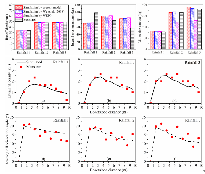 细沟形态演化会显著改变坡面径流侵蚀动力大小及其空间分布,进而又会对细沟侵蚀和发育过程产生重要影响。然而,到目前为止,已有的坡面侵蚀模型均难以实现细沟侵蚀与细沟形态演化过程的耦合模拟。买球官网王宁练教授团队的吴松柏博士等人在其2018年研究成果(Wu et al., 2018, WRR)的基础上,建立了一套典型细沟形态特征(包括细沟密度、细沟倾斜角、细沟宽度和深度)的模拟方法,并与考虑细沟平面形态的坡面降雨径流侵蚀模型进行耦合,实现了坡面细沟侵蚀与细沟形态演化的耦合模拟。同样采用中科院水保所的三场连续降雨侵蚀和细沟演化试验对模型进行验证,结果表示,模型不仅可以准确的计算径流量、侵蚀量及其空间分布,而且模型可以准确的反映典型细沟形态特征的演化过程(如图2所示)。该研究的主要创新点是实现了坡面侵蚀过程中细沟侵蚀与形态演化的耦合模拟,弥补了以往模型中的不足并为其进一步发展提供了思路。该研究成果受国家自然科学基金和中国博士后科学基金支持,已在水文领域Top 期刊《Water Resources Research》在线发表。