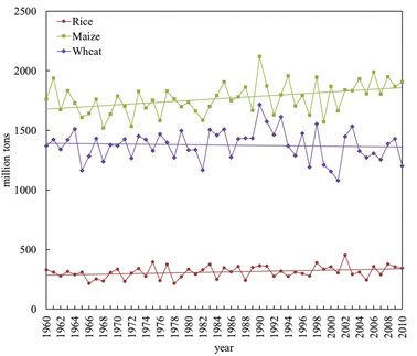 气候变化背景下的农作物生产潜力研究对充分利用土地和气候资源优化粮食生产具有重要意义。气候变化具有周期性波动和长期变化趋势两种特征,然而由此带来的农作物生产潜力周期性变化和长期趋势尚不清楚,影响不同农作物生产潜力的主要气候要素也有待深入挖掘。李飞副教授研究团队集成了全球农业生态区(GAEZ)模型和极点对称模态分解(ESMD)模型,探讨了1960-2010年间气候变化背景下中国三种主要农作物(小麦、水稻、玉米)的生产潜力变化趋势。研究发现,受气候变化影响三种作物生产潜力变化均具有准3年和准5年的周期。气候变化增加了玉米和大米的生产潜力,但降低了小麦的生产潜力。最低温度的升高是增加玉米和水稻生产潜力的主要原因,小麦生产潜力下降的主要原因是最高温度的升高。降水减少对三种农作物的生产潜力都产生了较大的负面影响。