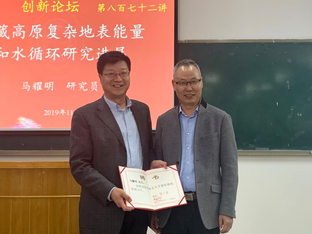 报告会开始前,王宁练教授向大家详细介绍了马耀明研究员的个人经历。马耀明研究员主要从事大气边界层观测及卫星遥感应用研究。曾负责国家重大科学研究计划项目、国家自然科学基金重点项目和面上项目、重大国际合作项目等近20项,同时是重大国际合作研究计划“全球能量水循环亚洲季风青藏高原试验研究”(GAME/Tibet)和“全球协调加强计划之亚澳季风青藏高原试验研究”(CAMP/ Tibet)的中方总协调人之一。已在国内外重要期刊上发表学术论文300余篇(第一作者和通讯作者79篇),出版英文专著1部。获2006年度气象科学和技术杰出青年奖,2008年获国家杰出青年基金资助,2009入选“新世纪百千万人才工程国家级人选”。介绍过后王宁练教授为马耀明研究员颁发买球官方网站兼职教授聘书。