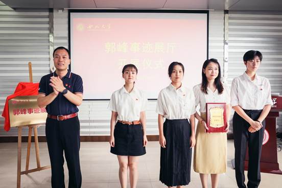 王亚杰、赵志华、吕建荣、田明纲,党(校)办、城环学院负责人等共同为郭峰事迹展厅揭牌;吕建荣为郭峰事迹讲解队授牌。