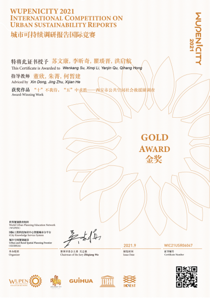 在城市可持续调研报告竞赛中,由董欣、朱菁、何皙健3位老师指导,2018级本科生苏文康、李昕奇、瞿琰晋、洪启航完成的作品《“十”不我待,“五”中求胜——西安市公共空间社会救援圈调查》获得金奖荣誉;2017级本科生吕研、谢超、王晶、魏婧怡完成的作品《街巷穿,生不息——生活圈建设视角下西安老城区街道生活性调查》,2018级本科生王若凡、刘妍、张若平完成的作品《缝合——城市街道空间连续性与共享性调查》等两个作品获得提名奖。