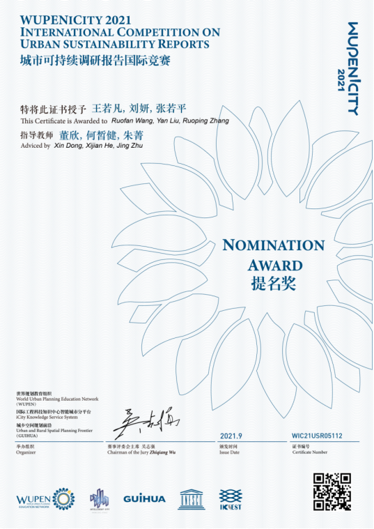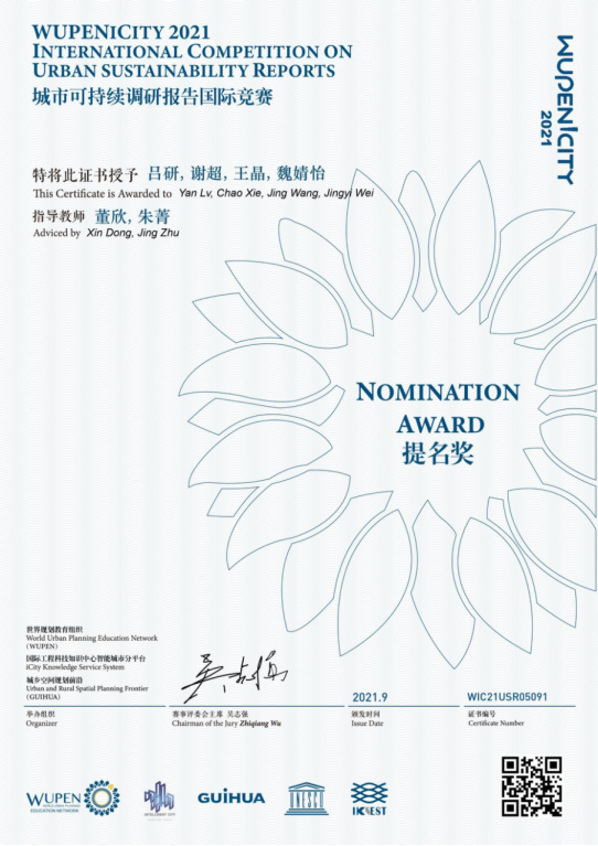 “2021世界规划教育组织-学生作品国际竞赛”由教育部城乡规划专业教学指导分委员会主任委员吴志强院士担任评委会主席,面向全球高等院校各专业本科学生和硕博士研究生,是目前城乡规划学科级别最高、最权威的国际竞赛之一。本次大赛共有来自同济大学、清华大学、北京大学、不来梅大学和香港大学等国内外知名高校在内的近百所高等院校共计4000余名师生参加,竞赛包含城市设计和城市可持续调研报告两个部分,赛事共设金奖100项,提名奖200项。