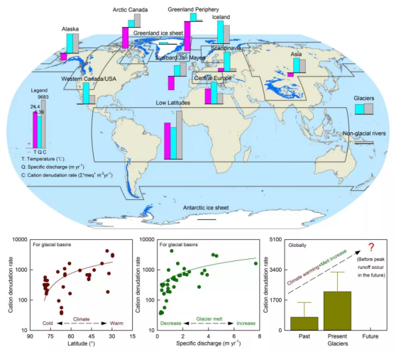 王宁练、李向应和张世强教授研究团队基于全球77条冰川5465个径流样品的阳离子浓度,评估并量化了当前气候背景下全球10个冰川区、全球冰川及南北极冰盖的阳离子剥蚀率(图1)。研究结果发现,当前冰川的化学风化速率是二十年前的3倍,是冰盖流域的10倍,是整个冰盖的50倍,是非冰川流域的4倍。冰川的化学风化速率与气温、降水和径流呈正相关关系、与纬度反相关,这表明冰川作为碳汇或碳源的能力在未来融水径流峰值出现之前会一直增强,冰川风化的物质产量也会一直增加,冰川对生态系统和碳循环的影响会进一步增大,冰川在区域或全球元素生物地球化学循环中的作用会越来越重要。