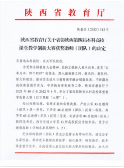 近日,陕西省教育厅公布了第四届陕西高校课堂教学创新大赛获奖教师名单,买球官网教师刘建红、吴玉伟、孙佩军团队荣获优秀奖。