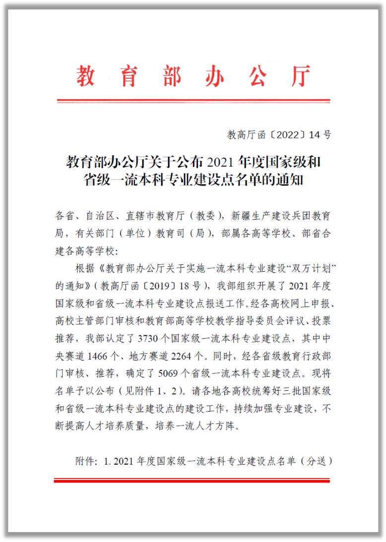 《教育部办公厅关于公布2021年度国家级和省级一流本科专业建设点名单的通知》(教高厅函〔2022〕14号)近日下发,买球官网2个专业入选一流本科专业建设“双万计划”,其中自然地理与资源环境专业获批国家级一流本科专业建设点、环境科学专业获批省级一流本科专业建设点。至此,学院共有4个专业入选一流本科专业建设“双万计划”,其中人文地理与城乡规划、城乡规划和自然地理与资源环境等3个专业入选国家级一流本科专业建设点及环境科学专业入选省级一流本科专业建设点。