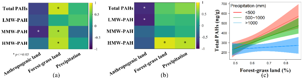 土地利用、降雨对PAHs组成之间相关性分析(a:旱季;b:雨季)和土地利用和降水对PAHs浓度的交互影响分析(c)