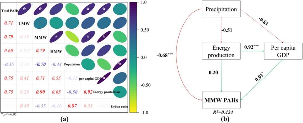 PAHs组成特征与人为因素之间的相关系数(a)及显示气候和人为因素对PAHs的直接和间接影响的结构方程模型(b)