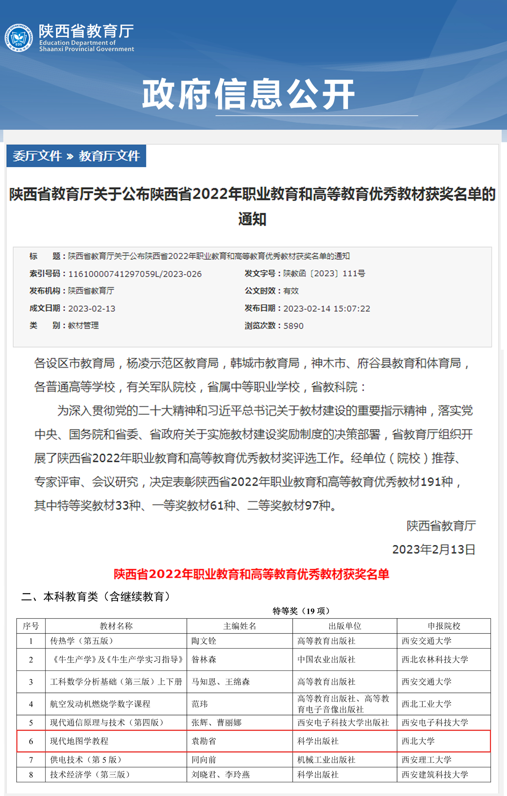 近日,陕西省2022年职业教育和高等教育优秀教材奖评选结果公布,学院教师袁勘省主编、刘万青、王雷等参编的教材《现代地图学教程》(第二版)荣获本科教育类优秀教材特等奖,学院教材建设工作取得了新突破。