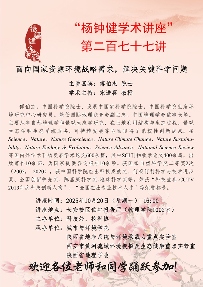 2025年10月20(星期一)下午16:00,由我校科技处、校科协主办,买球官方网站、陕西省地表系统与环境承载力重点实验室、西安市黄河流域环境模拟及生态健康重点实验室、陕西省地理学会承办的“杨钟健学术讲座”第二百七十七讲在长安校区物理学院伯宇报告厅举行。中国科学院院士、发展中国家科学院院士、中国科学院生态环境研究中心傅伯杰研究员应邀作了题为“面向国家资源环境战略需求,解决关键科学问题”的学术报告。本次学术讲座由宋进喜教授主持,买球官网师生积极参与。