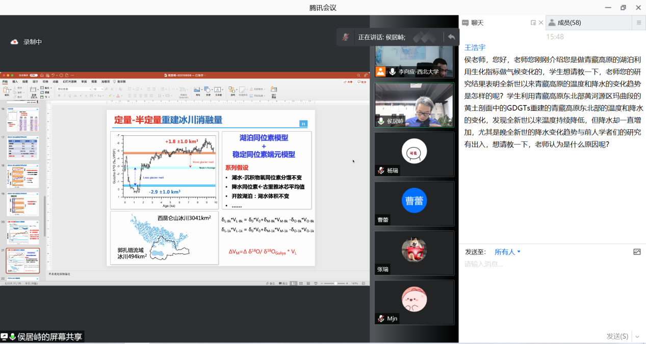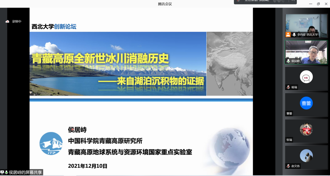 2021年12月10日星期五下午,由我校科技处、科协主办,买球官方网站、陕西省地表系统与环境承载力重点实验室承办的“买球官方网站创新论坛”第一千零一百九十讲暨“买球官方网站120周年校庆年”系列活动在在腾讯会议线上举行。中科院青藏高原研究所研究员侯居峙应邀为相关研究人员作了题为“青藏高原全新世冰川消融历史—来自湖泊沉积物的证据”的报告。学校相关研究人员和学生积极参加了本次报告会,报告由李向应教授主持。