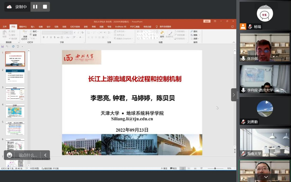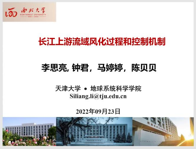 2022年9月23日(星期五)下午,由我校科技处、科协主办,买球官方网站、陕西省地表系统与环境承载力重点实验室承办的“买球官方网站创新论坛”第一千二百八十七讲暨“买球官方网站120周年校庆年”系列活动在腾讯会议线上举行。天津大学李思亮教授应邀为相关研究人员作了题为“长江上游流域化学风化过程和控制机制”的报告。校内外90余位相关研究人员和学生参加了本次报告会,报告由张世强教授主持。