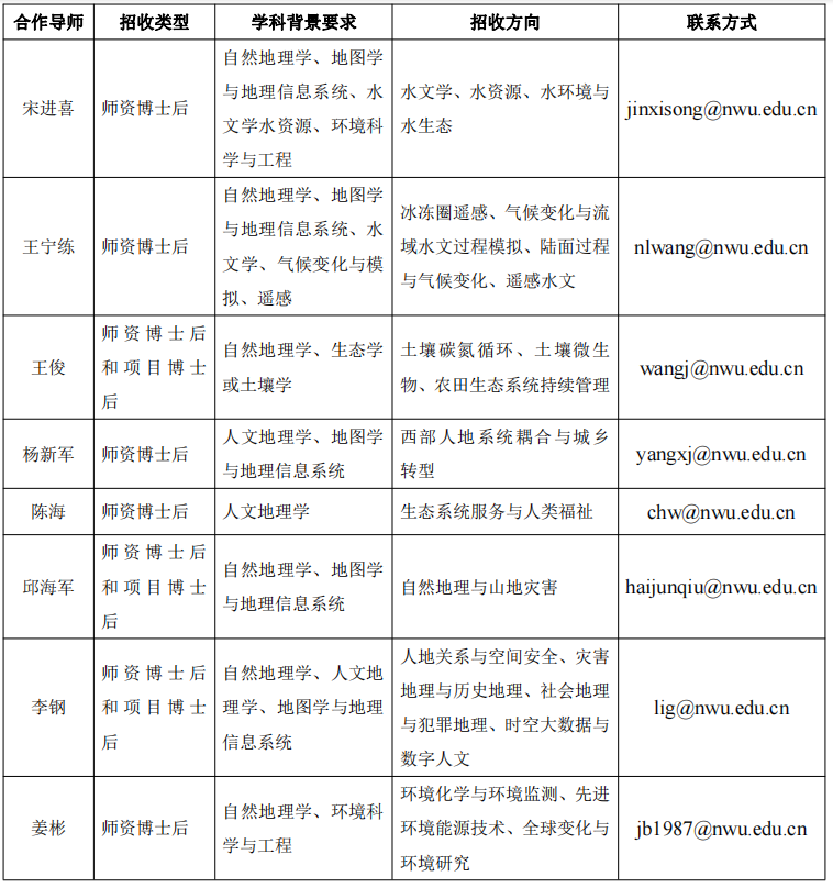 我站博士后合作导师、招收类型、学科背景要求、招收方向见下表。